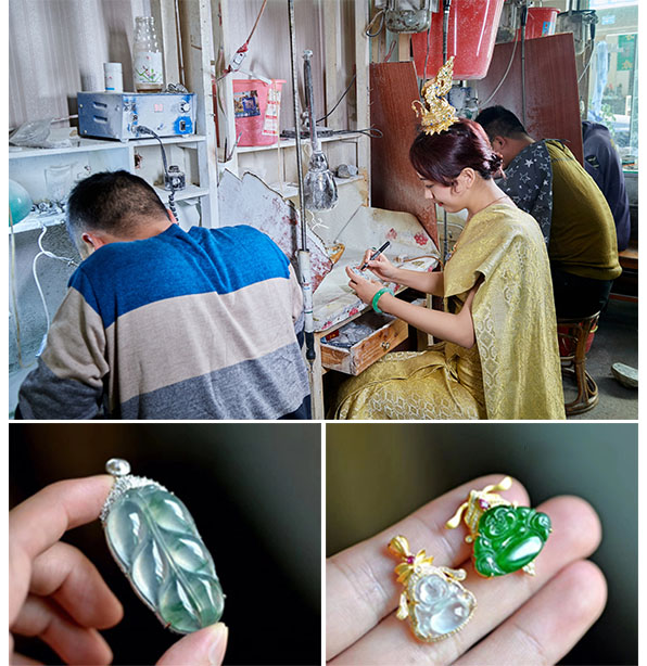 所有产品全部我们自己切割、雕刻、镶嵌,只有这样才能把成本压到极致,不然每一个环节交给别人都是成本上涨,大家就没办法获得最低价格了。到了下午我就会开始根据原石来画翡翠镶金的款式,让翡翠不仅珍贵也能优雅起来。