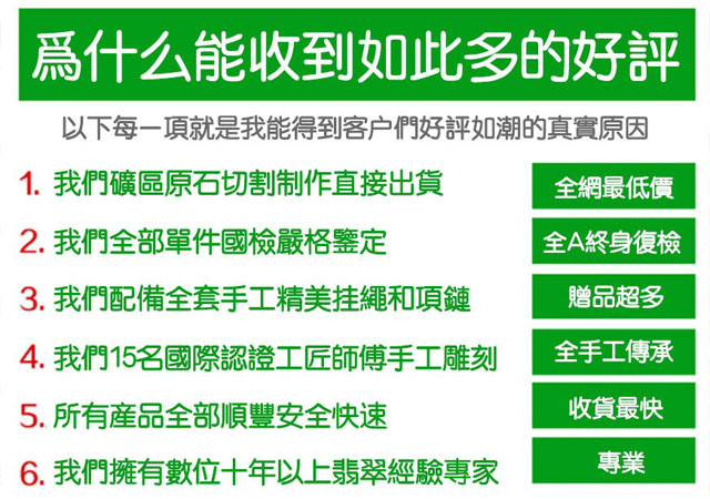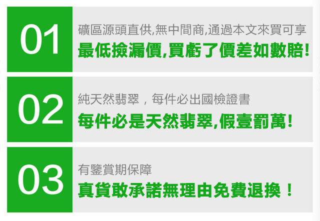我家的翡翠矿区原石直采,每件必自家工厂加工。杜绝一切人工处理,不注胶,不染色,更不以次充好。只把最真实最天然的翡翠带给大家,买我家翡翠的朋友我可以保证做到以下三点: