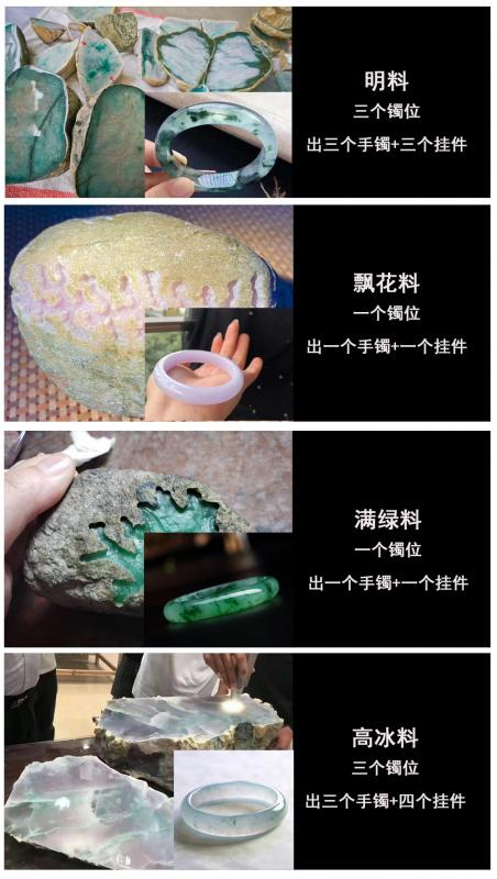 下图是翡翠原石加工出来的翡翠首饰,一石多用。一块原石=手镯+牌子+吊坠......平常我们买翡翠只能一件一件的买,而购买翡翠原石却可以一块原石出多个成品,边角料、镯心都是自己的,做到物尽其用。当然不止是图上这些,还有很多很多种类可以看我朋友圈。我 微信: (←长按复制去微信加好友),朋友圈有很多内容,多看看不懂及时问我,绝对有帮助!>
