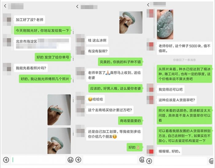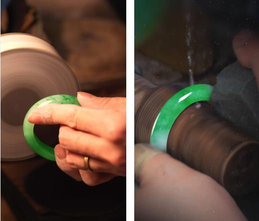从毛料,设计、加工,打磨到成品,整套流程都是自家完成,我每天会在朋友圈发一些我们设计的翡翠手镯、饰品,帮助客户了解更多真实客观的信息,维护客户的知情权。