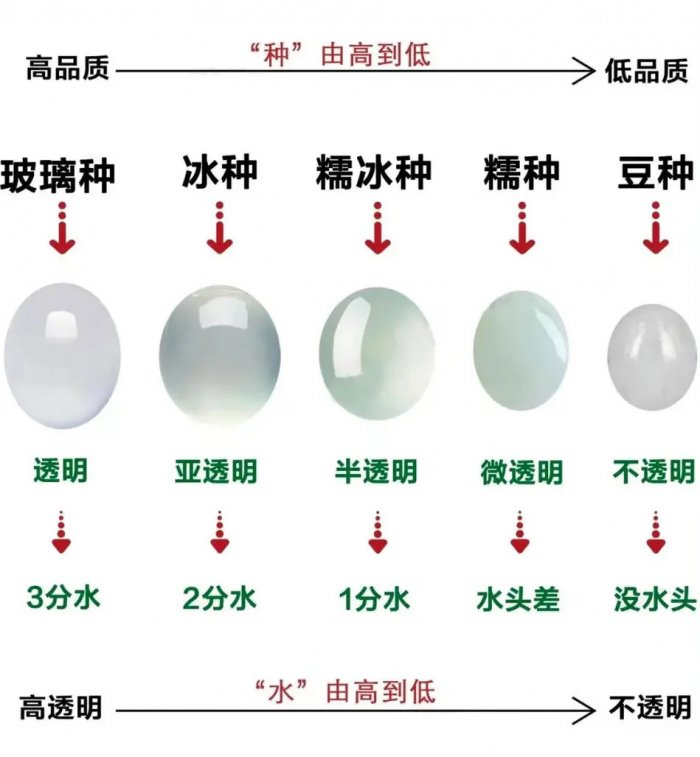 通常来说,结晶颗粒越细腻,透明度越高,透反射光泽越强(即起莹光),则种越好,如玻璃种、冰种;反之则种越 差,如豆种。